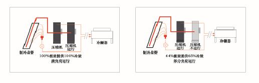 u 部分负荷运行:主压缩机运行,60%的冷媒作制冷循环,这样蒸发盘管和冷凝盘管相对而言能力过量,冷媒吸入压力增加而排出压力减少,部分负荷性能系数可增大到5.0,既44%的能量即可输出65%的制冷量;