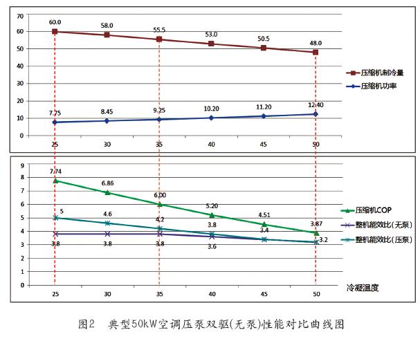 如图2典型50kW压缩机和氟泵双驱空调与未采用氟泵技术空调制冷量及能效随冷凝温度变化曲线图所示,冷凝温度继续降低至25℃,压缩机功耗较之35℃可降低16%,制冷量增大8%,整机能效提高31%。
