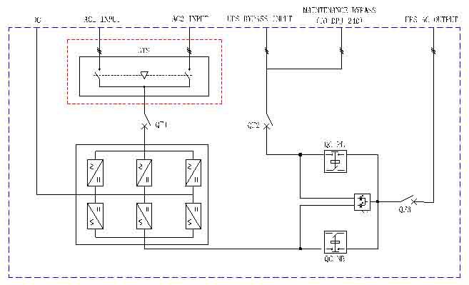 静态开关采用混合型控制技术,由快速半导体器件(可控硅)和电磁接触器并联组成的高效AC开关,它既解决了切换时间问题,又提高了静态开关的抗冲击和抗短路能力,使系统的可靠性、稳定性大大提高。