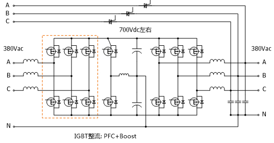 而到上世纪90年代,第三代沟槽型IGBT面世,其耐压能力提升至1200V,促使了UPS技 术的革新。通过整流侧高频升压电路将母线电压提升至700V左右,逆变器输出电压可以做到380V,输出变压器得以取消。而这种整流逆变电路都工作在高频 (几kHz以上)且没有输出变压器的UPS就被称为高频UPS。图-2所示为一典型的高频机拓扑。