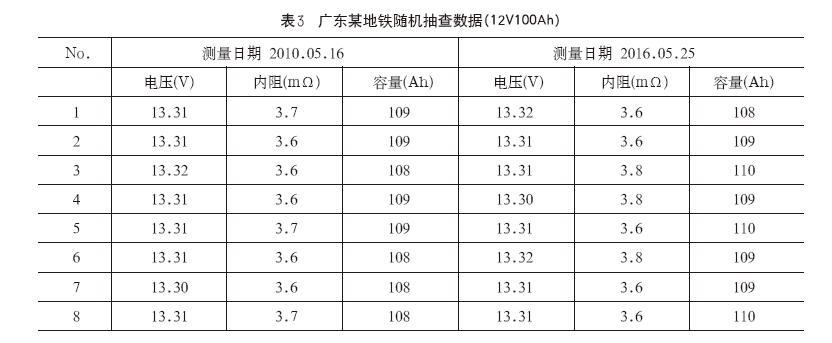根据调查,在北美Switch数据中心、Latisys数据中心、DigitalRealityTrust数据中心、Facebook数据中心、香港机场、香港地铁、广州地铁等用户中,均有大量的纯铅薄极板电池在投入使用,经过长时间跟踪测试发现,纯铅薄极板电池均一性好、使用温度范围宽、支持间歇式充电、无一例发现有电池变形、漏液等明显的制造瑕疵,用户普遍评价较好。表3为广东某地铁随机抽查数据(12V100Ah)。