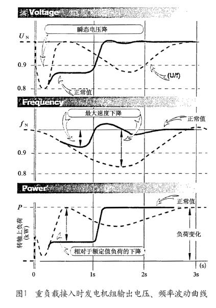 在某国外知名品牌柴油发电机组上做过接入重负载试验,测试曲线如图1所示。