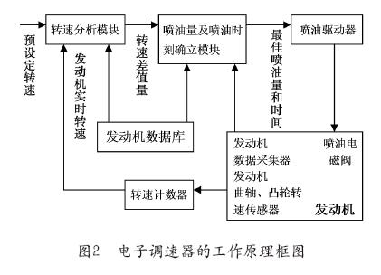 电子调速器的特点是,它将发动机的各功能部件的工作状态智能地联系并协同成一个整体,综合研判它们的实时参数并求得最佳值,以此作为指令将燃油按照最适宜的时刻和油量由电磁阀(油门)喷入汽缸爆燃,驱动主轴转动,使发动机在额定的输出功率范围内,无论被驱动负载怎样变化,都能以迅速、精确的调控确保转速稳定在25r/s。它的工作程序是:位于主轴和凸轮轴的两个转速传感器将信号送至转速计数器,得出实时的发动机转速,并在转速分析模块与来自数据库的最佳算法及预设转速一起解析求出转速差值。喷油量及喷油时刻确立模块把转速差值、数据库来的典型值和从发动机采集的相关数据进行全面分析,确立出最佳的喷油量及喷油时刻并指令喷油驱动器打开喷油电磁阀,使发动机既可将燃油充分地爆燃转为驱动主轴转动的机械能,又可减少污染物的排放。