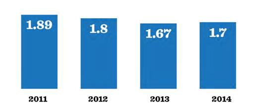 提升数据中心能源效率的第一步,便是审慎评估能源使用效率(PUE,Power Usage Effectiveness),简单来说,PUE就是数据中心总耗电除以IT设备总耗电,或是数据中心总设施消耗的能源除以IT设备消耗的能源。PUE是由GreenGrid所召集的政府及产业专家组成的项目小组所制定的一项指标,不仅信赖度高,而且可以用来检验机房的能源效率,可以广为适用于一般数据中心,目的是建立一个“一致且可重复使用的衡量指标”,提供数据中心管理者持续监控并改善能耗状况。根据UptimeInstitute于2014年进行的调查研究显示,全球业界平均PUE为1.7,高于2013年的1.67,但低于2012年的1.8,表示机房节能仍有改善空间(如图1)。