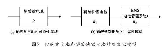 对于磷酸铁锂蓄电池组而言,由于其一致性差等固有缺点,就必须要有对蓄电池充电过程和放电过程进行管理等保护措施和相关的管理控制,故电池管理系统(BMS)或相关功能是必不可少的,并成为电池组的必要组成部分。理论上分析,在结构上相当于在裸电池后面串联了BMS,即一个化学电源和一个电子电源设备的串联,如图3b)所示。其可靠性为R1×R2。因R1≤1且R2≤R1,故即使磷酸铁锂电池本身的可靠性R1与铅酸蓄电池的可靠性R相同,R1×R2≤R,故可以得出磷酸铁锂电池的可靠性是要低于铅酸蓄电池的。实际使用情况也是如此。