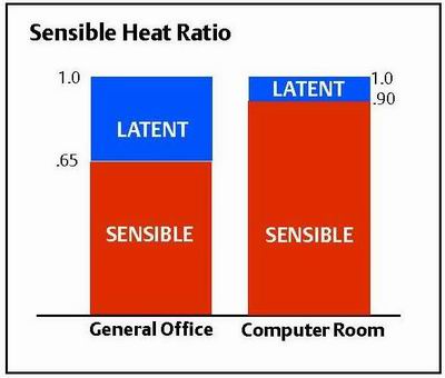 图1 普通办公环境中,60%-70% 为显热负载(.6-.7 SHR ),而计算机机房有90%-100% 的显热负载(.85-1.0 SHR )。