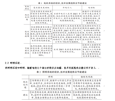 将电机系统中变压器、发电机、外电引入、电动机几个部分的现状及问题、技术发展趋势及建议列于表1。