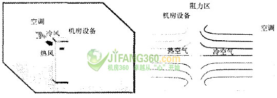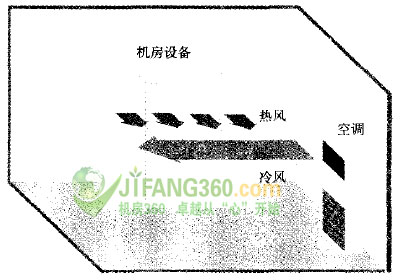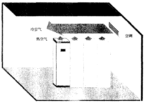 如图1所示,当前通信设备多采用风扇冷却方式。且通常采用前端进风,后端出风的形式。空调的出风口对准设备后方,冷空气与从设备内出来的热风会合,会很快使气温降低,但空调的高速出风,会对通信设备热空气的排出产生一个风阻,削弱了通信设备热空气的排出速度,使得热空气在通信设备内(尤其是模块设备,如电源模块)产生滞留,从而使设备内局部温度升高。因此,在这种情况下,会造成环境温度低,而设备内温度高的“似低温环境”现象,不利于设备的健康使用。有的用户在此方式下,甚至打开后门让空调风对着面吹,以为利于设备散热。根据电源厂家对这种情况与空调侧吹的情况做了温升对比,对比对象为在同一负载条件下同型号的两套通信电源系统的模块机内温度。空调前面侧吹的系统,在模块后内侧1寸处空气温升约为13℃,而打开后门对里面正吹的电源,虽然感觉不到电源设备发热,但模块内相同位置的温升却达到15℃~16℃,并没有使电源模块的散热得到合理改善。