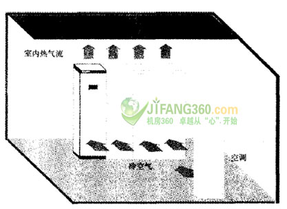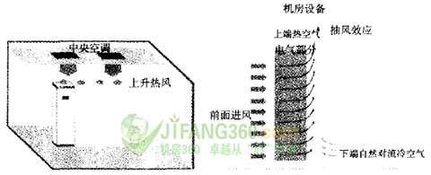 若按图3所示将通信设备置于中央空调出风口下端,虽然下行的冷空气会迅速与上升的热空气产生热交换使之冷却,但下行的风压会对上行的热空气形成阻力,破坏抽风效应的形成,使热空气滞留设备内部,同样产生环境温度低,而设备内温度高的“假低温环境”现象,不利于设备的健康使用,尤其对后门无通风孔或通风孔不足,而对抽风效应依赖的设备,影响更大。