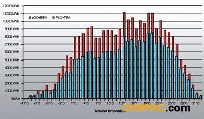 E2V的高效调理性和适应能力意味着空调体系能够运转在最大功率下。当室外温度合当令(夜间或冬秋季月份),可将冷凝压力下降至10bar,从而下降了耗电量。另一方面,机械式热力胀大阀总是强制机组运转在冷凝压力超越17bar的情况下。在较热的气候情况下,电子胀大阀的长处是能够更好地利用蒸腾器;在较冷的气候下,其能够下降机组的运转压力,从而下降耗电量,进步功率。
