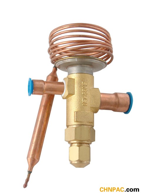 3、胀大阀的品种:(内平衡、外平衡) 效果于热力胀大阀体内传动膜片下部的压力为节省后的蒸腾压力(这一压力经过传动杆和传动片的缝隙而进入膜片下部分空间)这种结构称为内平衡式胀大阀。 效果于热力胀大阀体内传动膜片下部的压力不是节省后的蒸腾压力,而是经过外接平衡管将蒸腾器出口端的压力引进传动膜片下部空间结构的阀门、称为外平衡式热力胀大阀。 与内平衡式胀大阀比较,外平衡式热力胀大阀的过热度要小得多,所以选用外平衡式热力胀大阀时,能充分发挥蒸腾器的传热面积的效果和进步制冷设备的效果,在蒸腾器阻力较小、压力丢失不大的情况下,可选用内平衡式热力胀大阀;当蒸腾阻力较大,压力丢失比较大或具有液体分配器时,应选用外平衡式热力胀大阀。选用分配器的,一般都选用外平衡胀大阀。 在专用空调机中选用的通常是外平衡式热力胀大阀。热力胀大阀虽仅仅一个很小的部件,但它在制冷体系中的效果必不可少,所以它与制冷紧缩机、蒸腾器、冷凝器、并称为制冷体系四大部件。