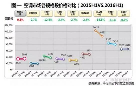 第二,除APF一级柜机外,绝大部分规格产品均价开始稳定。虽然从各规格产品均价同比降幅来看,所有规格产品的均价都在下降,其中尤以高能效产品为重.(见图一)。但这其实是由于空调产品在2015下半年进行了大幅降价。