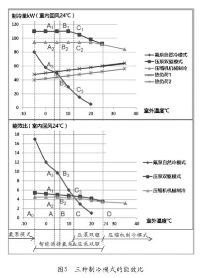 图2表达了三种制冷模式所提供的制冷量和室内的热负荷情况;图3表达了三种制冷模式的能效比。首先保证制冷量大于室内需求,然后确定选择哪种能效比最高的运行模式。