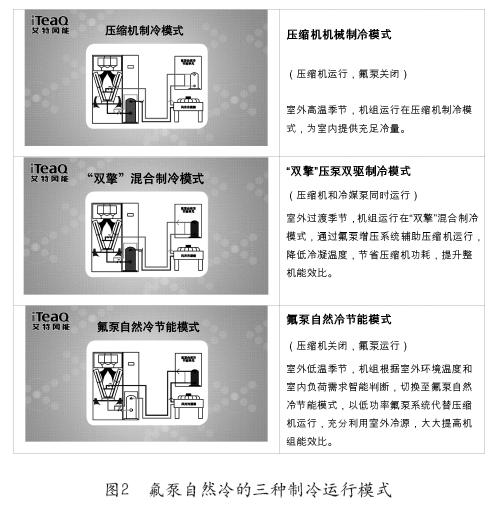氟泵自然冷有三种制冷运行模式:压缩机机械制冷模式、“双擎”压泵双驱制冷模式和氟泵自然冷节能模式,如图2所示。